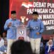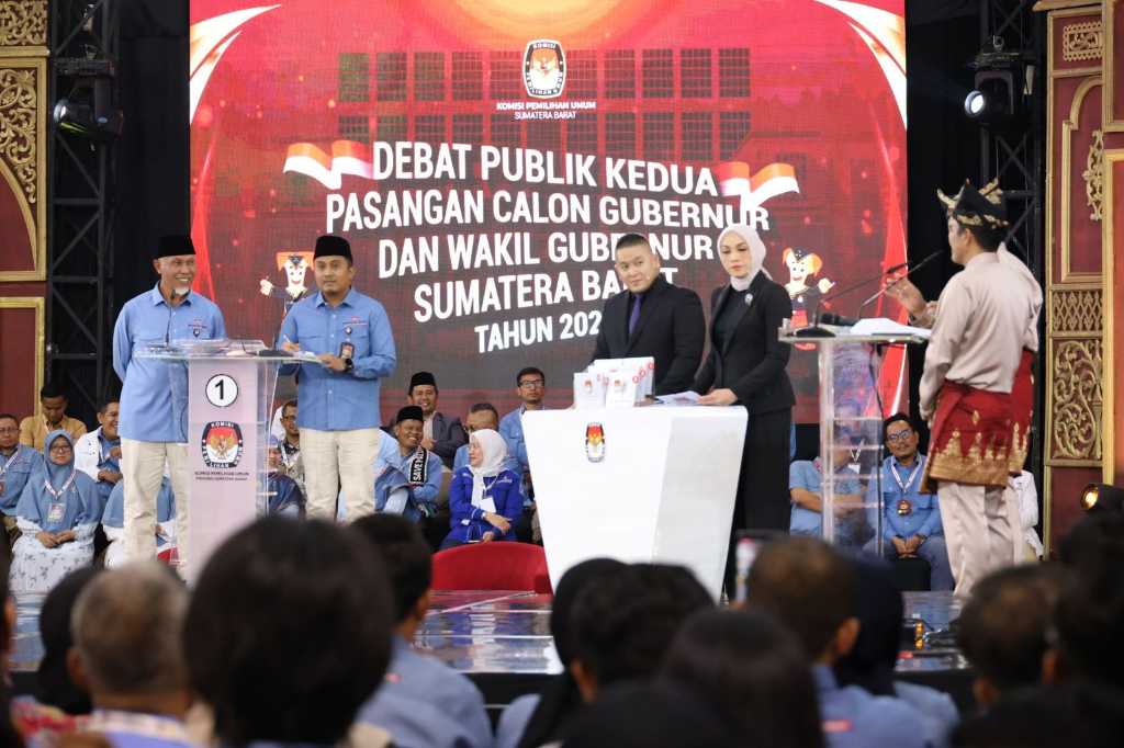 Padang – Calon Gubernur dan Wakil Gubernur pasangan nomor urut 1 Mahyeldi-Vasko, memberikan tanggapan terhadap jawaban pasangan nomor urut 2, Epyardi-Ekos, terkait program revitalisasi koperasi di Sumbar pada Debat publik kedua Pemilihan Gubernur Sumatera Barat 2024, Selasa (19/11/2024).
