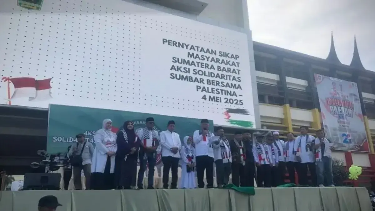 PADANG, RADARSUMBAR.COM – Masyarakat Sumatera Barat (Sumbar) bersama sejumlah organisasi kemasyarakatan (ormas) menyatakan 10 sikap tegas sebagai bentuk solidaritas terhadap rakyat Palestina dan penolakan terhadap kekejaman rezim Zionis Israel. Pernyataan ini disampaikan langsung oleh Gubernur Sumbar bersama para pimpinan ormas dalam aksi bela Palestina yang digelar di halaman Kantor Gubernur Sumbar.