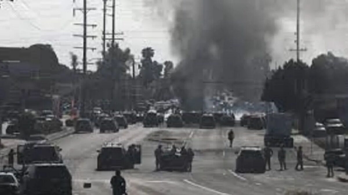 Asap tebal terlihat saat para pengunjuk rasa bentrok dengan deputi sheriff Los Angeles di Paramont, Los Angeles County, California, Amerika Serikat (7/6/2025). (ANTARA/Xinhua/Qiu Chen/aa.)