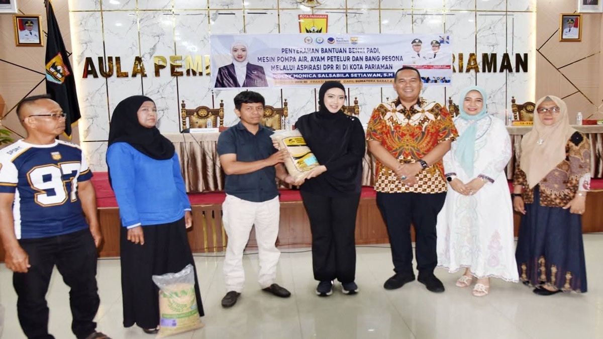 PARIAMAN, RADARSUMBAR.COM – Anggota DPR RI, Cindy Monica Salsabila Setiawan, menyerahkan secara simbolis bantuan benih padi, mesin pompa air, ayam petelur, dan Bang Pesona kepada warga Kota Pariaman, Minggu (19/01/2026), di Aula Balaikota Pariaman.