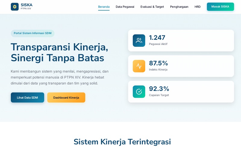 Data dalam https://siska.ptpnxiv.com/ menunjukkan terdapat 1.247 pegawai aktif yang tercatat dalam sistem. Indeks kinerja mencapai 87,5 persen. Angka ini mencerminkan konsistensi pencapaian target kerja.