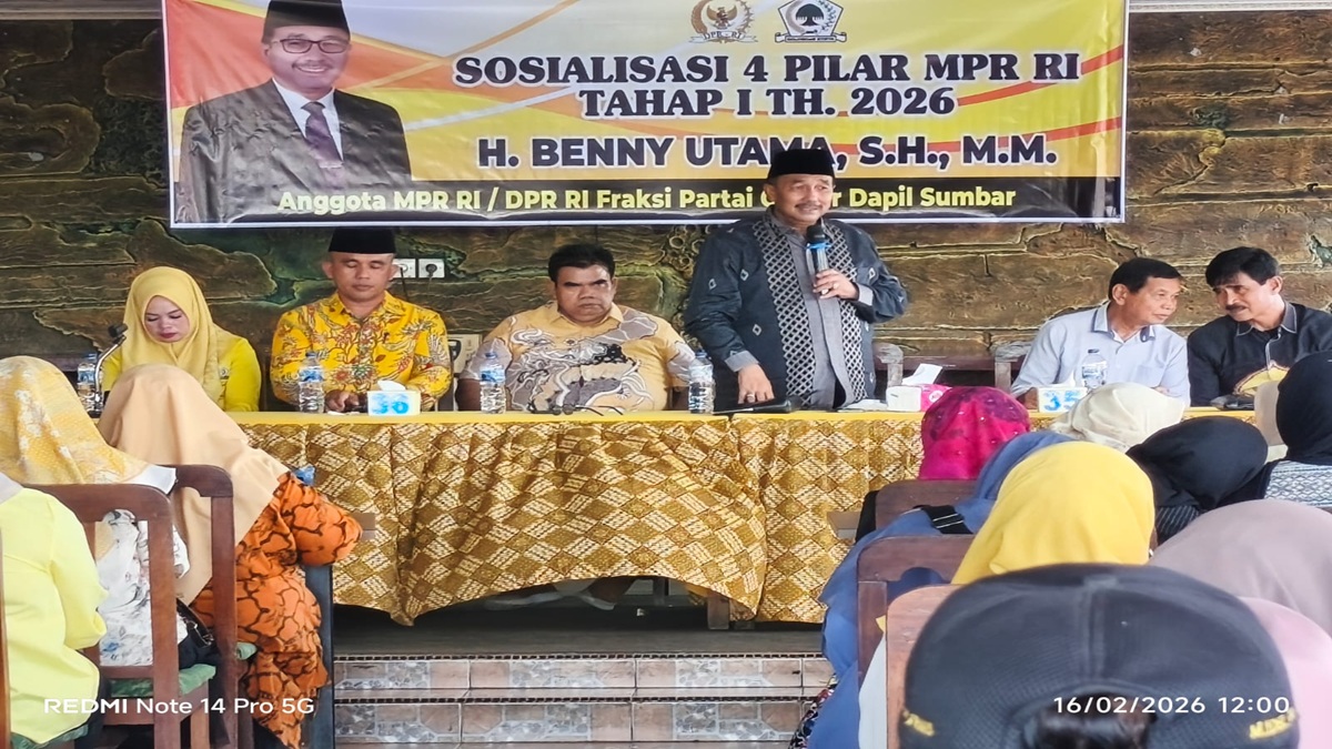 SIMPANGEMPAT, RADARSUMBAR.COM – Anggota Komisi III DPR RI Fraksi Partai Golkar Daerah Pemilihan Sumatera Barat, Benni Utama, menggelar Sosialisasi 4 Pilar Kebangsaan Tahap I Tahun 2026 di Aula Rumah Makan Berna Jambak, Kabupaten Pasaman Barat, Senin (16/2/2026).