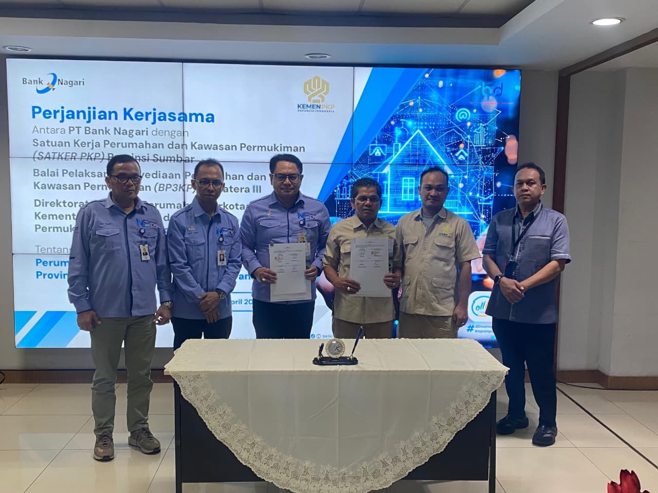 PADANG, RADARSUMBAR.COM-Komitmen mendukung peningkatan kualitas hunian masyarakat berpenghasilan rendah kembali ditegaskan PT Bank Nagari melalui penandatanganan perjanjian kerja sama dengan Satuan Kerja Perumahan dan Kawasan Permukiman (Satker PKP) Sumatera Barat, Balai Pelaksana Penyediaan Perumahan dan Kawasan Permukiman (BP3KP) Sumatera III, di bawah Direktorat Jenderal Perumahan Perdesaan Kementerian Perumahan dan Kawasan Permukiman Republik Indonesia.