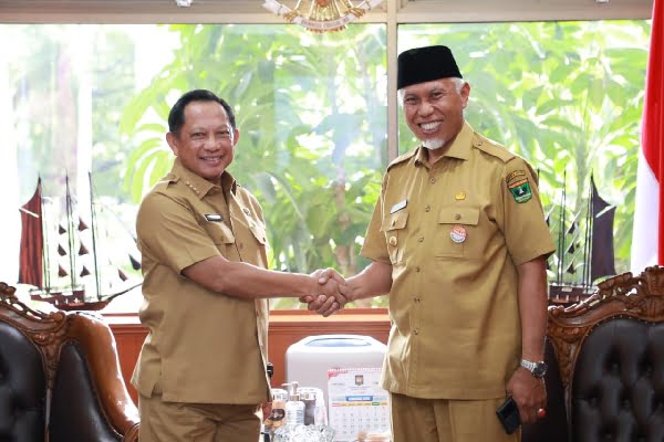 Menteri Dalam Negeri (Mendagri), Muhammad Tito Karnavian (kiri) dan Gubernur Sumbar, Mahyeldi. Gubernur menemui Mendagri untuk menyampaikan kesiapan peringatan HUT Satpol PP dan Satlinmas di Sumbar. (Foto: Dok. Adpim)
