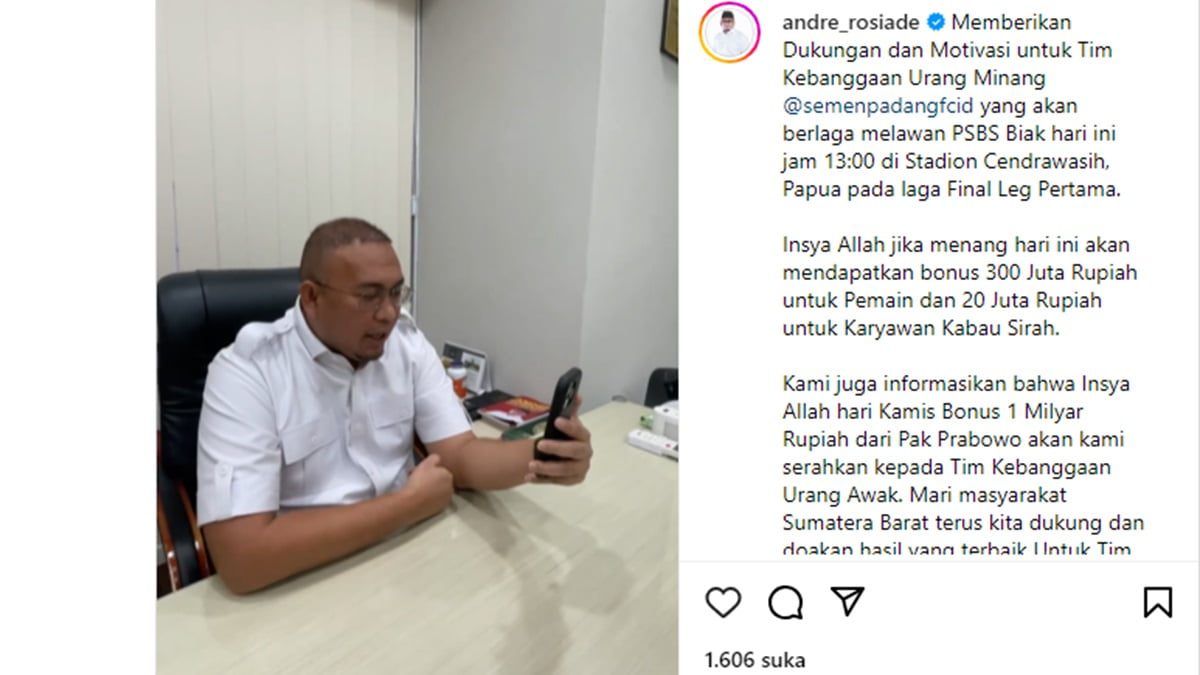 “Insha Allah jika menang hari ini, kita akan berikan bonus Rp300 Juta untuk pemain dan Rp20 Juta untuk karyawan Kabau Sirah,” ucap Andre Rosiade.
