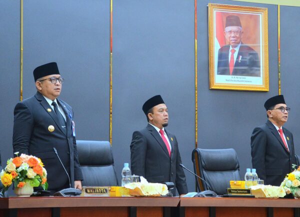 PADANG, RADARSUMBAR.COM – Penjabat Wali Kota (Pj Wako) Padang, Andree Harmadi Algamar bersama unsur Forkopimda Kota Padang, mendengarkan pidato kenegaraan Presiden Republik Indonesia Joko Widodo secara daring di dalam Rapat Paripurna Istimewa DPRD Kota Padang, di Ruang Sidang Utama Kantor DPRD, Jumat (16/8/2024) siang.
