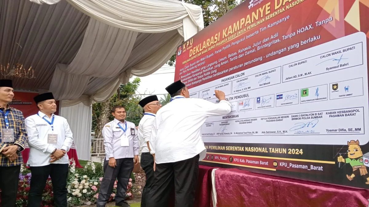 SIMPANGEMPAT, RADARSUMBAR.COM – Komisi Pemilihan Umum (KPU) Kabupaten Pasaman Barat, Provinsi Sumatera Barat menggelar deklarasi kampanye damai pemilihan bupati dan wakil bupati pada Pemilihan Kepala Daerah (Pilkada) 2024, Senin.