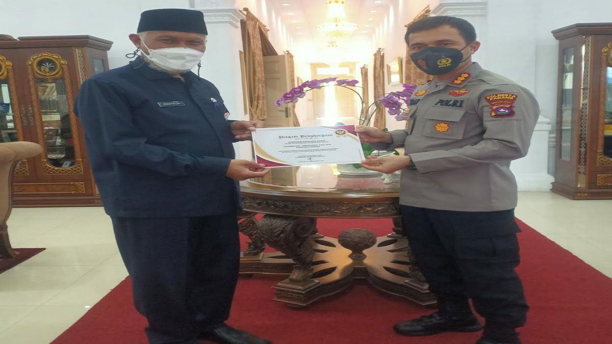 PADANG, RADARSUMBAR. COM – Gubernur Sumbar Mahyeldi Ansharullah memberikan penghargaan kepada Kapolresta Padang Kombes Pol Imran Amir karena dianggap berhasil memberikan kenyamanan kepada warganya dari aksi-aksi kriminalitas. Penghargaan tersebut diserahkan Gubernur di Kantor Gubernuran Sumbar, Selasa (2/11).