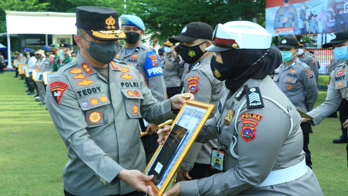 Bripka Gustianis Hermita Hia yang berdinas di Bamin Subditregident Ditlantas Polda Sumbar mendapat penghargaan dua kali berturut turut oleh Kapolda Sumbar Irjen Pol Teddy Minahasa.