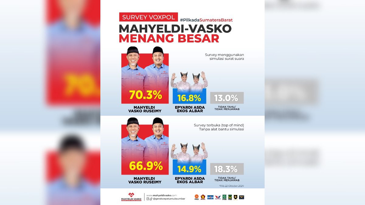 Survei nasional merilis Mahyeldi-Vasko Unggul sangat tinggi sekali yaitu 70,3%, sedangkan kompotitor dibawah 20%an, Jika diadakan pencoblosan hari ini itu hasilnya, Penulis antara percaya dengan tidak percaya dengan survei tersebut.