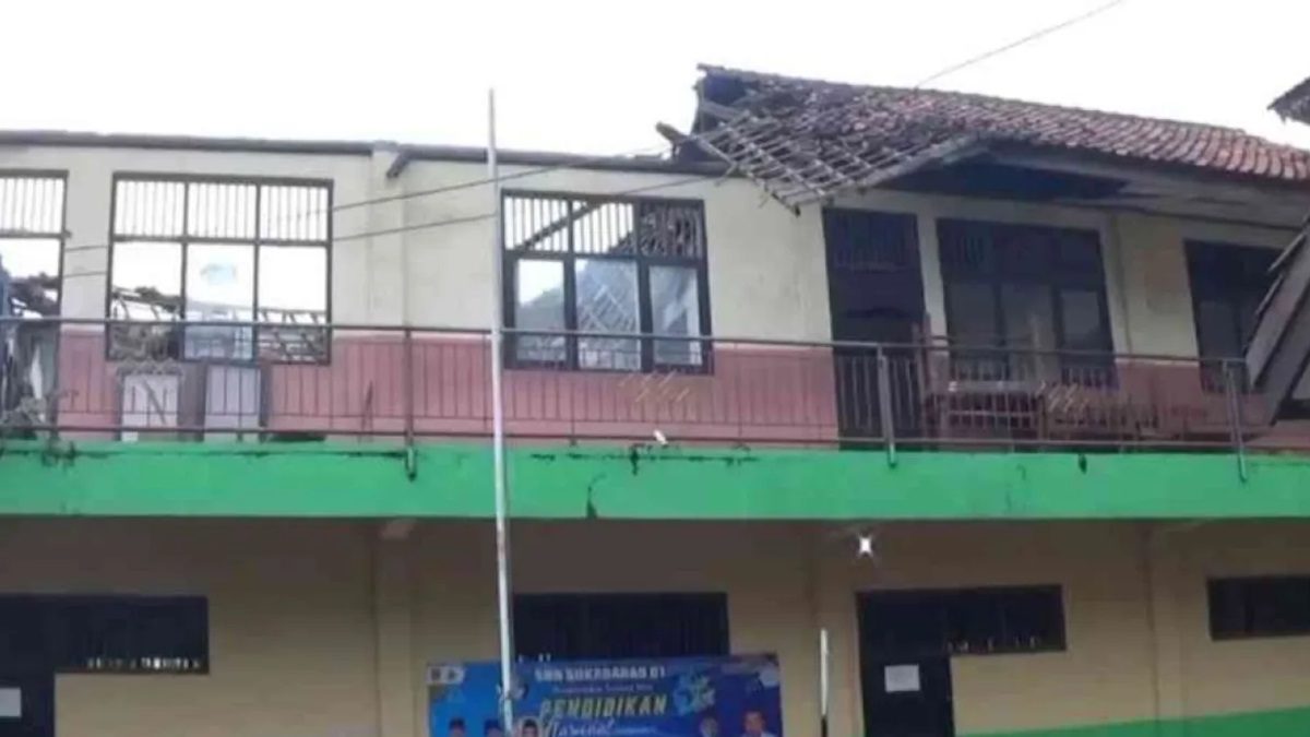 Kondisi SDN 01 Sukadanau, Kecamatan Cikarang Barat, Kabupaten Bekasi, Jawa Barat usai atap lantai dua ambruk akibat terpaan angin kencang pada Sabtu (6/5/2023). (ANTARA/Pradita Kurniawan Syah)