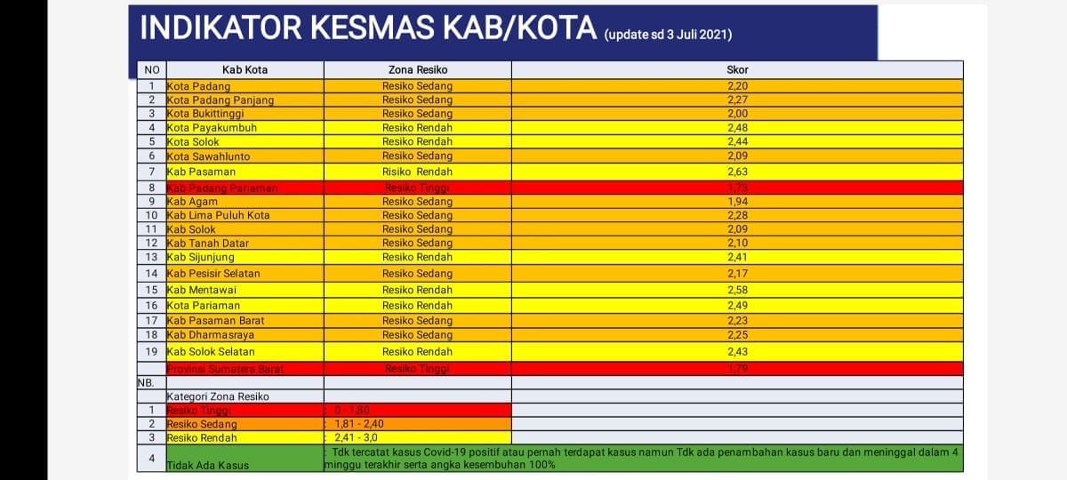 Sesuai indikator kesehatan masyarakat seluruh kabupaten/kota di Sumatera Barat, Padang berada di angka 2,2. Sedangkan batas zona merah di angka 1,8. Sementara, secara keseluruhan di seluruh Indonesia, Provinsi Sumatera Barat berada di zona merah.