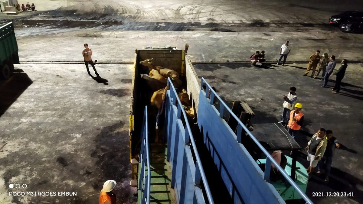 Senin (20/12/2021) malam, sudah datang 300 ekor sapi untuk program subsidi bagi peternak di Sumbar. Sapi-sapi ini dikirim dari Makasar menggunakan KM Camara Nusantara 1 yang merupakan kapal plat khusus untuk mengangkut bahan pangan dan ternak.