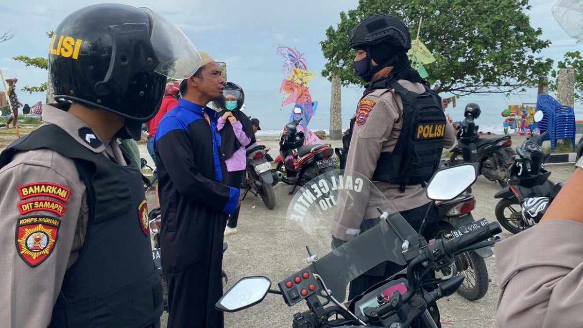 PADANG, RADARSUMBAR.COM – Sejumlah personel polisi dari Sabhara Polresta Padang melakukan patroli disepanjang Pantai Padang untuk mengingatkan pengunjung pantai mematuhi protokol kesehatan (prokes).