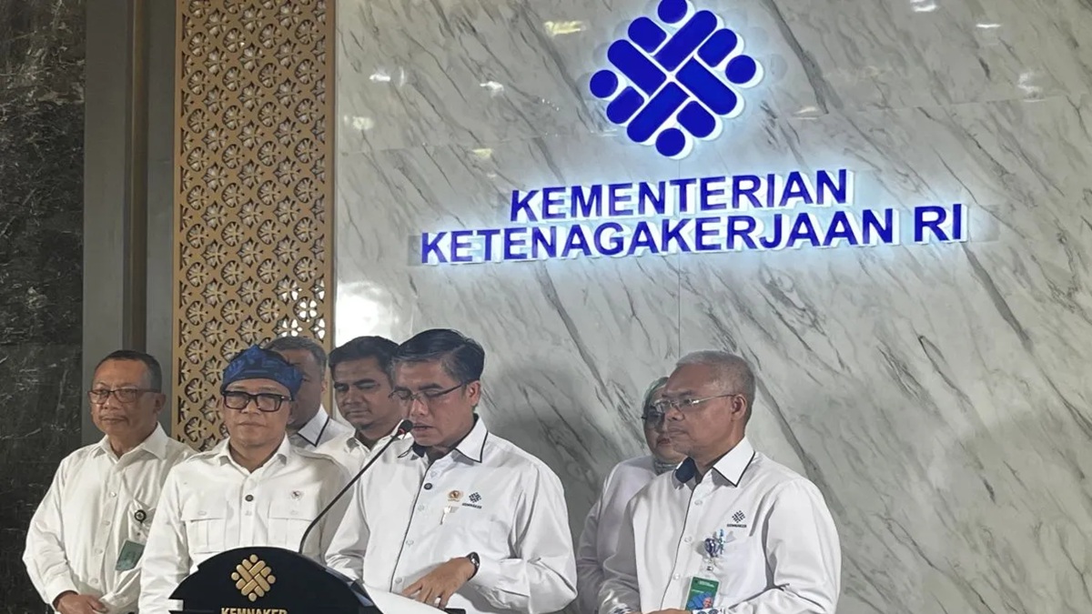 Menteri Ketenagakerjaan (Menaker) Yassierli saat memberikan keterangan pers di Kantor Kemnaker RI Jakarta, Selasa (20/5/2025). (ANTARA/Arnidhya Nur Zhafira)