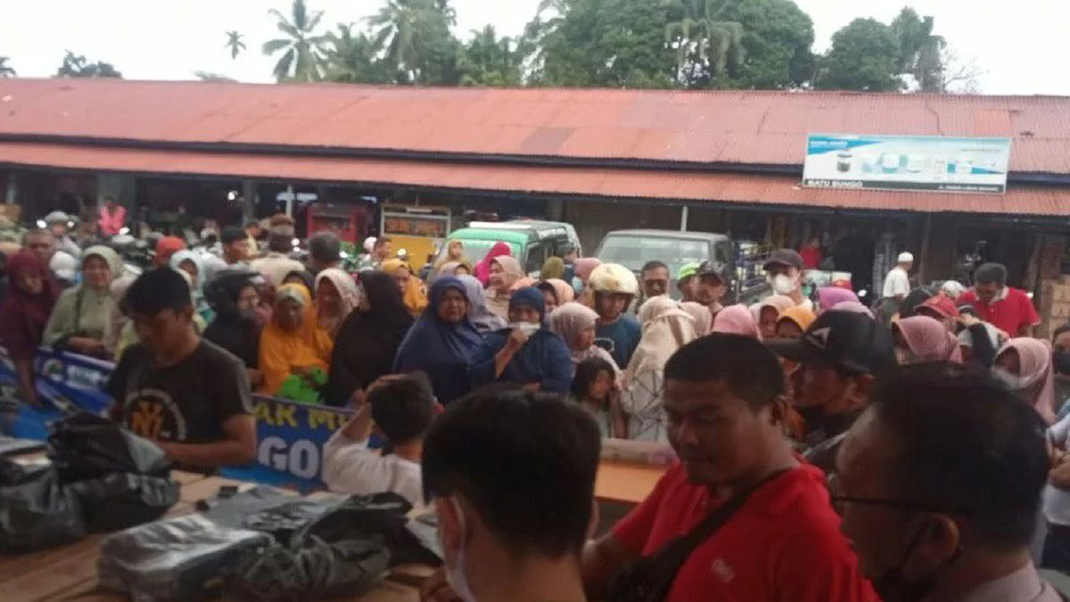LUBUK BASUNG, RADARSUMBAR.COM – Operasi pasar murah minyak goreng di Pasar Terminal Antokan Kecamatan Lubukbasung, Kabupaten Agam, Sumatera Barat pada Rabu (26/1/2022) ramai pembeli karena harga jual yang cukup murah hanya Rp14 ribu per liter.