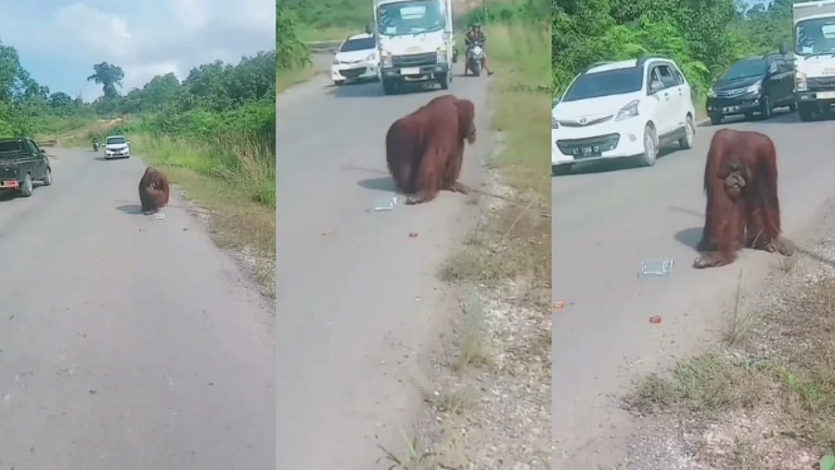 Dalam unggahan video itu memperlihatkan seekor orang utan sedang berjalan di jalan beraspal yang dilalui motor dan mobil.