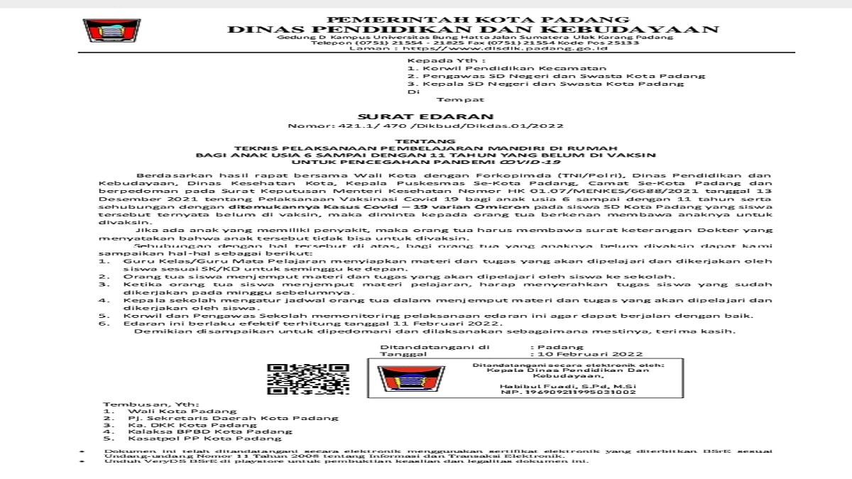 Sedangkan bagi mereka yang tidak divaksin, pembelajaran dilakukan secara mandiri di rumah yang dibimbing oleh orang tua. Menindaklanjuti hal tersebut, Dinas Pendidikan dan Kebudayaan (Disdikbud) Kota Padang mengeluarkan SE Nomor: 421.1/470/Dikbud/Dikdas.01/2022 Tanggal 10 Februari 2022 tentang Teknis pelaksanaan Pembelajaran Mandiri di Rumah bagi Anak Usia 6-11 Tahun yang Belum Divaksin untuk Pencegahan Pandemi COVID-19 yang ditandatangani oleh Kadisdikbud Kota Padang Habibul Fuadi.