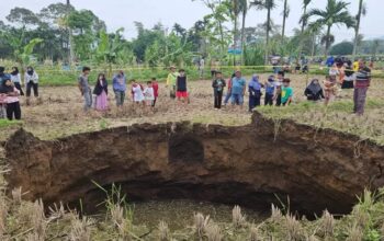 Amblesan tanah terjadi secara misterius di kawasan pertanian milik warga di Jorong Tepi pada 4 Januari 2026. Diameter lubang tersebut mencapai sekitar 20 meter dengan kedalaman kurang lebih 15 meter. (rdr/ant)