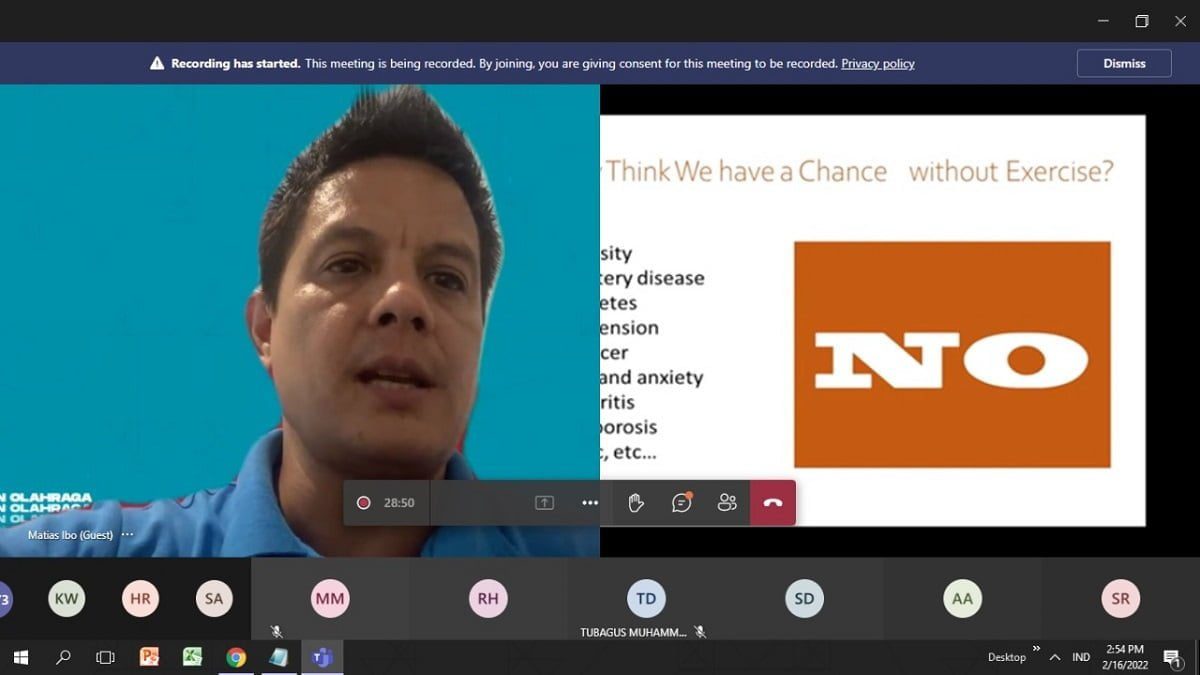 “Secara bertahap kita harus meningkatkan kesehatan. Jadi, mari kita rutin berolahraga,” ujar Tubagus seraya mengingatkan seluruh peserta webinar untuk mematuhi prokes.
