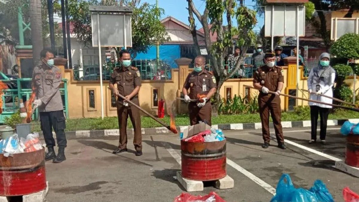 Pemusnahan barang bukti di halaman Kantor Kejari Padang, pada Selasa (31/5/2022). (ANTARA/Fathul Abdi)