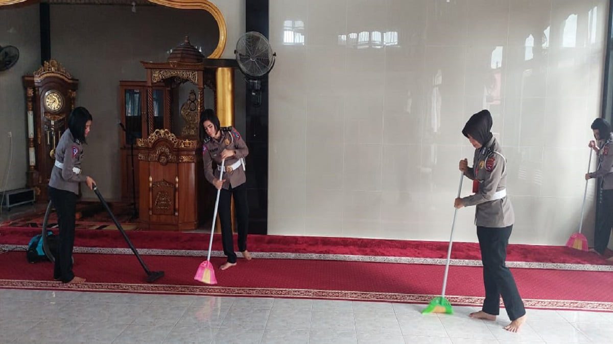 PADANG, RADARSUMBAR.COM – Untuk memeriahkan Hari Bhayangkara ke 76, puluhan anggota Ditlantas Polda Sumbar termasuk polisi wanita (polwan) melakukan kegiatan bersih-bersih di Masjid Istiqmah, Jalan Durian Ratus RT 02 RW 07, Kelurahan Kurao Pagang, Kecamatan Nanggalo, Kota Padang Senin (20/6/2022).