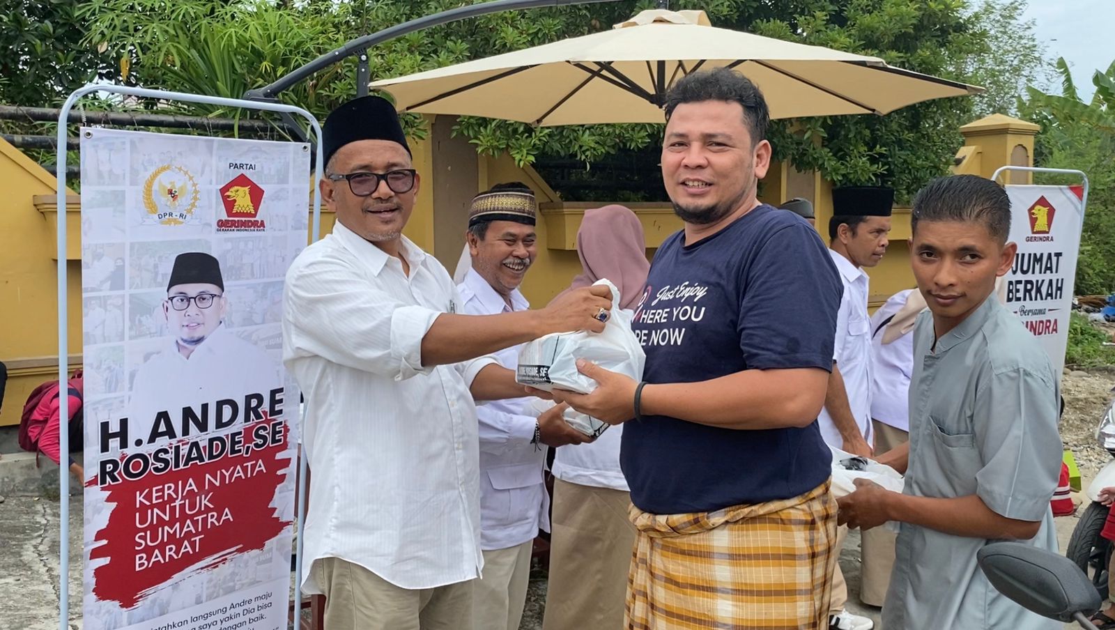 PADANG, RADARSUMBAR.COM-Anggota DPR RI asal Sumbar H Andre Rosiade melalui tim menggelar Jumat Berkah bersama Partai Gerindra di Masjid Mukhlisin, Kurao Pagang, Kecamatan Nanggalo, Kota Padang, Jumat (22/7). Tidak hanya berbagi ratusan nasi kotak dan snack, Andre juga berencana akan membantu pembangunan masjid yang masih terbengkalai.