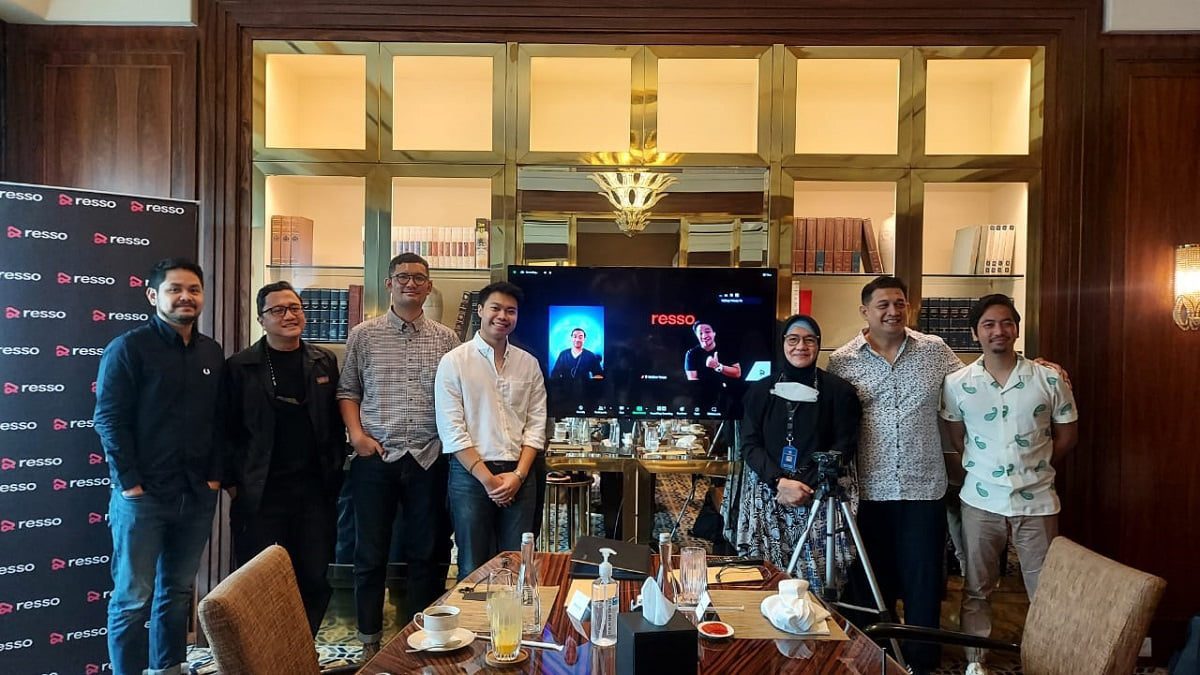 Peserta diskusi 'Breakfast with Resso' berfoto bersama setelah pertemuan secara hibrida berakhir. (ki-ka) Christo Putra, Wendi Putranto, Gembira Agam, Faiz Novascotia, Selliane Halia Ishak, Aldo Sianturi, Mahwari Sadewa Jalutama. Hadir secara daring: Al Sobry, Matthew Tanaya. (IST)
