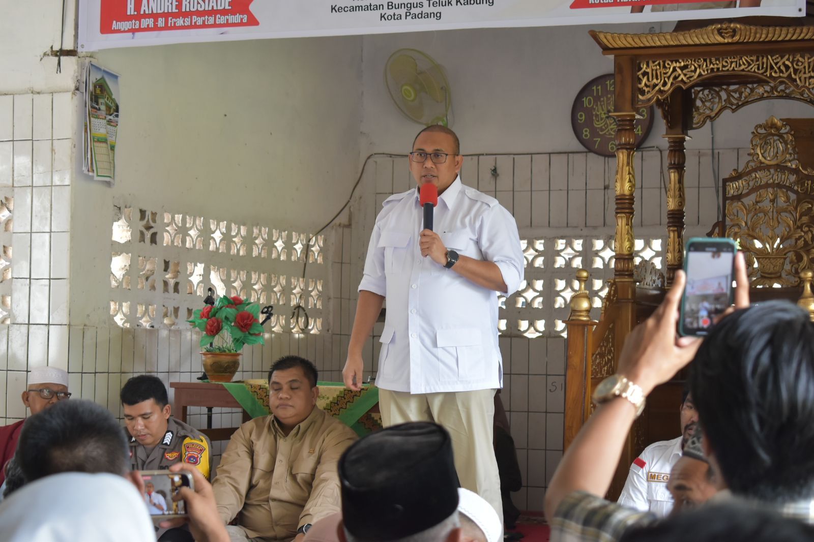 Seperti saat penyerahan bantuan di Mushalla Al Mukhlisin di Bungus Barat, Bungtekab, Kota Padang, Andre menyebutkan, Prabowo selalu berpesan untuk kader dan pejuang politik harus selalu hadir dan mendengar masyarakat. Jadi solusi masyarakat. “Kami anggota DPR wajib hukumnya membantu masyarakat. Kami akan berkeliling mengeksekusi kebutuhan masyarakat. Di Padang kami bantu Pasar Raya Padang dan Pasar Belimbing,” katanya.