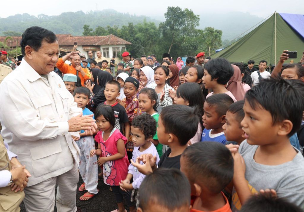 Tiba di lokasi, Prabowo langsung menengok masyarakat termasuk para lansia. Prabowo memberikan pelukan hangat seraya menjenguk dan mengecek kondisi mereka. Prabowo juga menyambangi para anak yang ada di pengungsian, mengecek kondisi dan menghibur mereka agar tetap ceria. Terlihat Prabowo menggendong dan mengecup sayang para anak-anak di pengungsian tersebut.