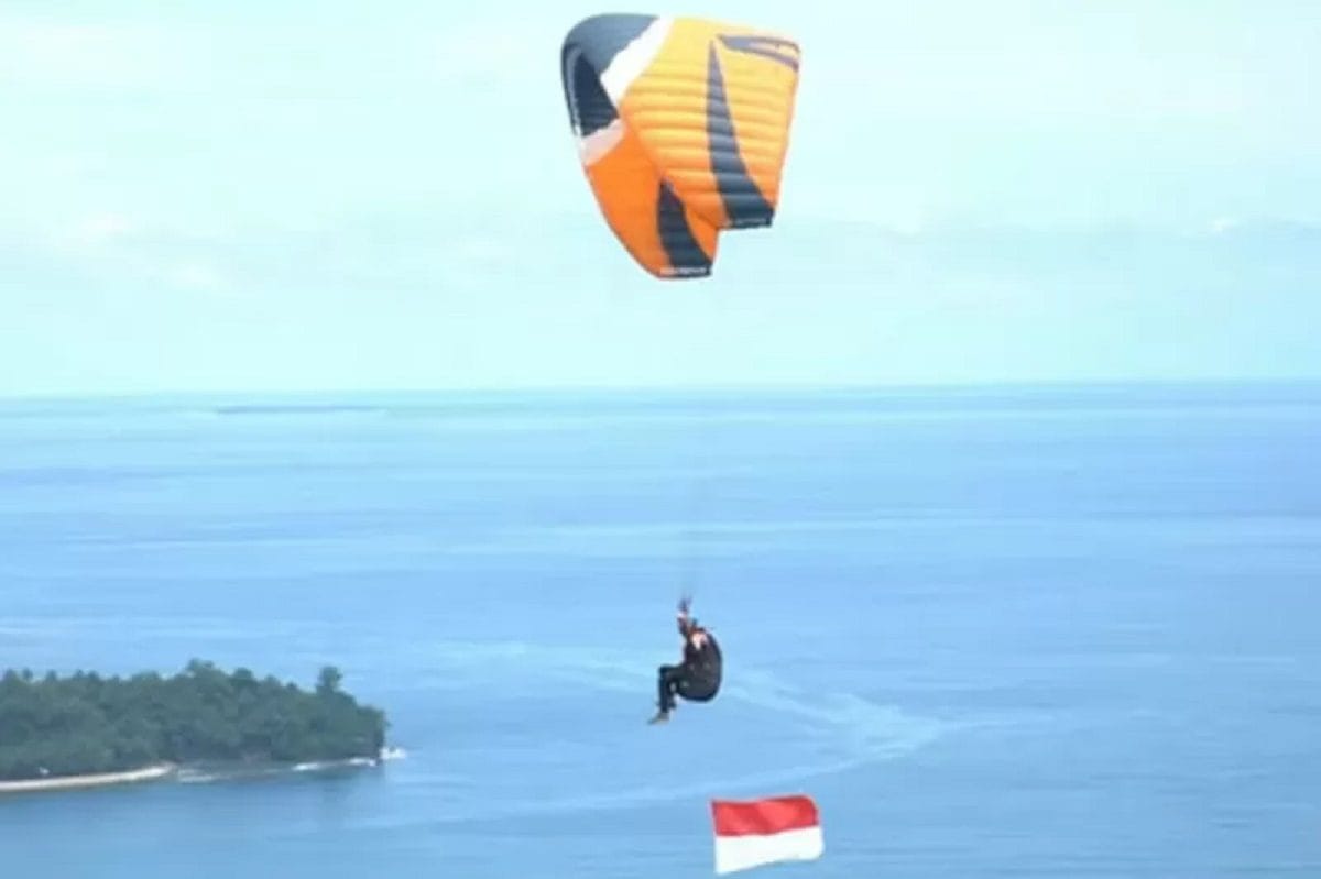 Selanjutnya, personel TNI AU Lanud Sutan Sjahrir juga lepas landas dengan parasut yang dibawa. Tak lupa bendera merah putih juga dibawa terbang bersama dirinya. Paralayang itu mengambang di udara dan dikendalikan dengan baik hingga mendarat di titik yang telah ditentukan.