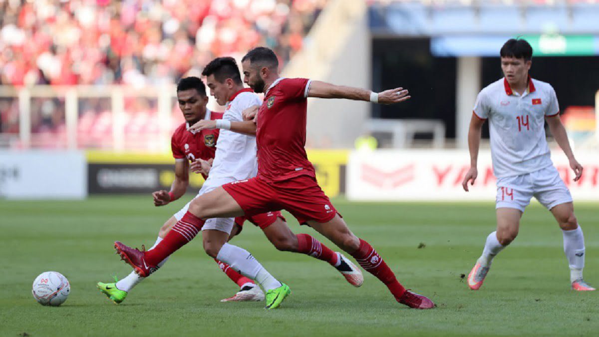 Jordi Amat dan Rahmat Irianto berebut bola dengan pemain Vietnam. (PSSI)