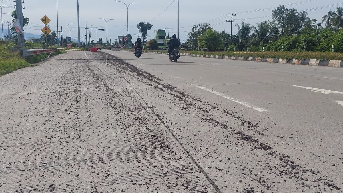 Cangkang-cangkang sawit tersebut berserakan dari pinggir hingga ke tengah jalan. Seperti yang terlihat di depan Gerbang Tol Kasang, Kabupaten Padang Pariaman dan di Simpang Lubuk Minturun, Kecamatan Koto Tangah, Kota Padang.