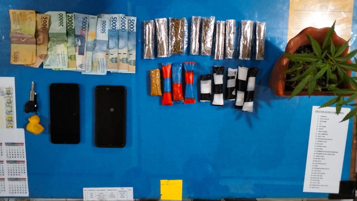 Rincinya, barang haram yang disita polisi, yakni 20 paket ganja kering dan 25 paket kecil sabu-sabu. Empat pelaku tersebut berinisial DS, 25 tahun, FM, 29 tahun, RF, 23 tahun, dan AB, 26 tahun.