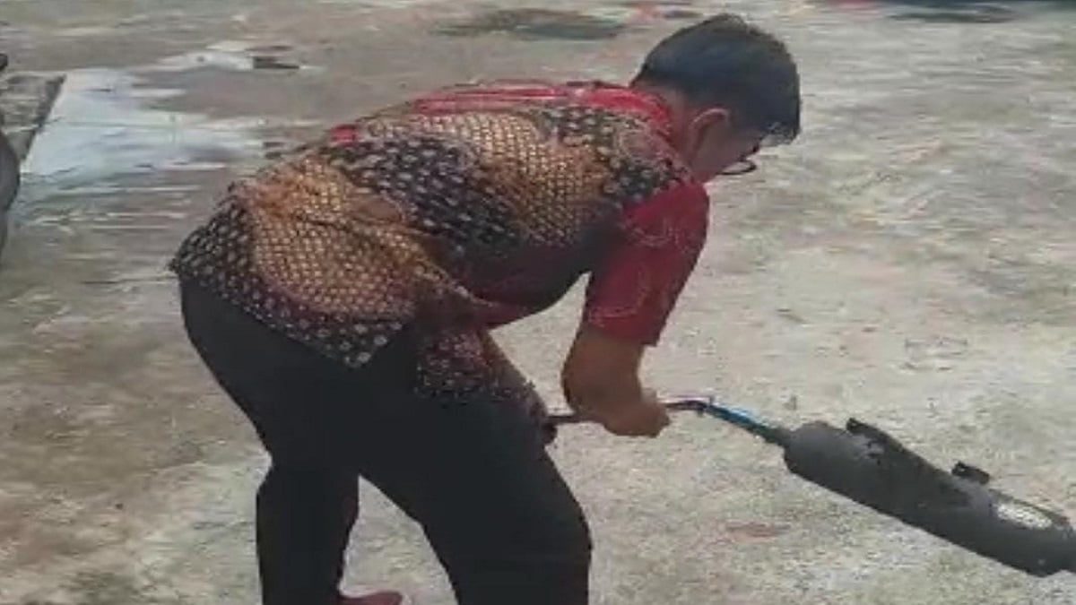 Penuh amarah, dia pun menghancurkan sendiri knalpot brong atau racing yang terpasang di motornya. Aksi pada Jumat (24/2/2023) siang itu sontak jadi tontonan para pelanggar lainnya.