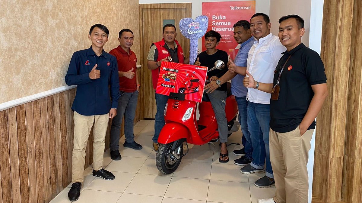 Manager Branch Telkomsel Padang, Ali Wardana mengucapkan selamat kepada pemenang program Poin Festival 2022, dimana kali ini salah satu pelanggan Telkomsel di Sungai Rumbai yang memangkan hadiah 1 unit Motor Vespa LX 125.