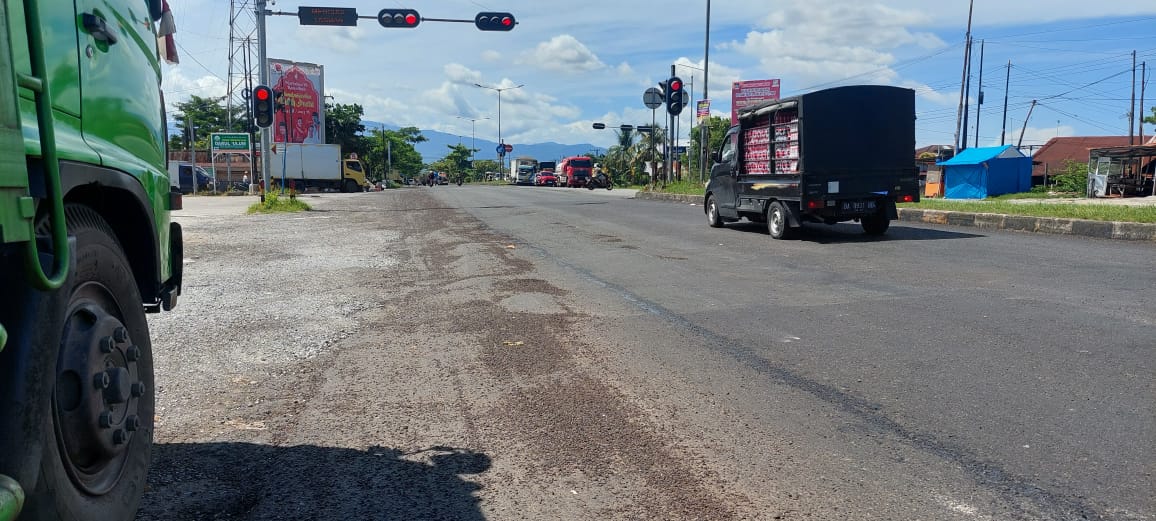 Kondisi jalan menjadi licin saat dilewati. Pengendara yang melintas tampak berhati-hati melewati lokasi tersebut.