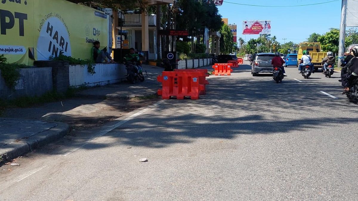 Pantauan Radarsumbar.com pada Selasa (11/4/2023) siang, di depan Basko Grand Mall terlihat ada beberapa water barrier yang terbuat dari plastik yang diisi air berjajar. Tidak terlihat kendaraan terparkir di sana, jalan menjadi lancar dan tidak ada kemacetan.