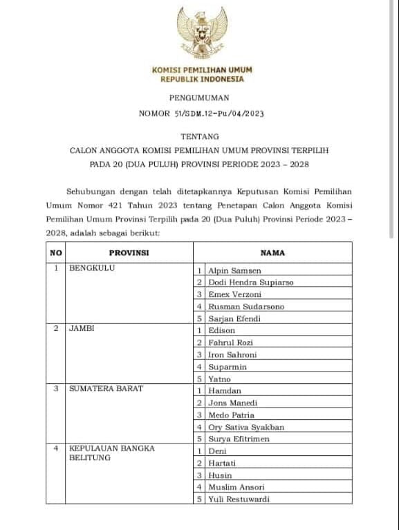 Keputusan itu tertuang di dalam pengumuman Nomor 51/SDM.12-Pu/04/2023 tentang Calon Anggota KPU Provinsi terpilih pada 20 provinsi periode 2023-2028.