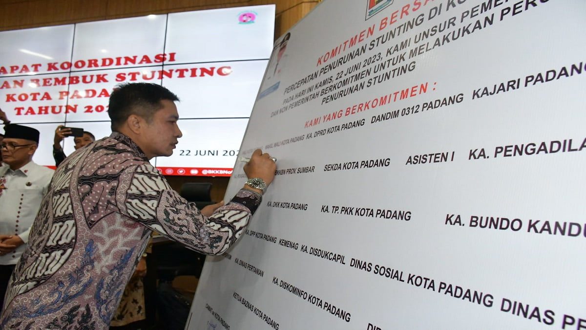 Wakil Wali Kota Padang Ekos Albar menandatangani komitmen bersama penurunan stunting. (Foto: Dok. Diskominfo Padang)