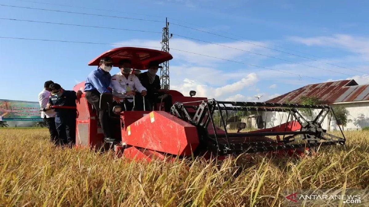 Menteri Pertanian Republik Indonesia Syahrul Yasin Limpo sedang mengoperasikan mesin panen padi saat panen di Kecamatan 2x11 Enam Lingkung, Kabupaten Padang Pariaman, Sumatera Barat (Sumbar), Selasa. (Antarasumbar/Aadiaat M.S.)