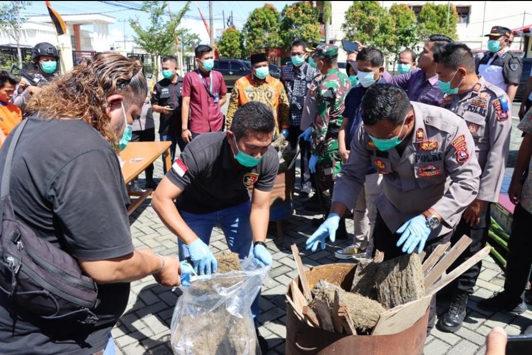 PARIAMAN, RADARSUMBAR.COM – Sebanyak 77 paket besar narkoba jenis ganja kering hasil tangkapan dimusnakan di depan Mapolres Pariaman, Kamis (14/7/2023). Pemusnakan tersebut dipimpin Kapolres Pariaman AKBP Abdul Aziz.