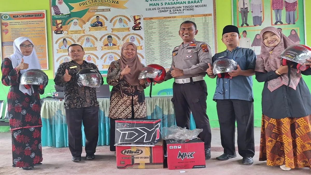 Ia mengatakan sebagai bentuk kepedulian keselamatan masyarakat dan menekan angka kecelakaan lalu lintas disaat menggunakan kendaraan bermotor di jalan raya, Satlantas Polres Pasaman Barat juga membagikan helm kepada pihak sekolah MAN 5 Pasaman Barat.