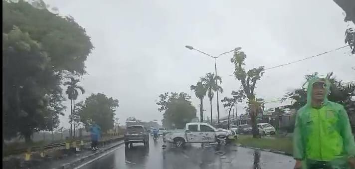 “Kondisi mobil melintang di tengah jalan dan menutup setengah dari jalan ini,” kata salah seorang pengendara, Anto (34).