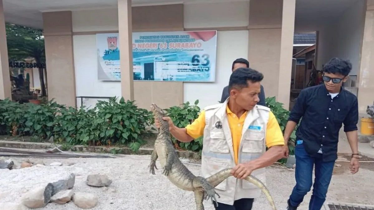 Sesampai di SDN 63 Surabayo, biawak tersebut langsung ditangkap dan dibawa ke kantor.