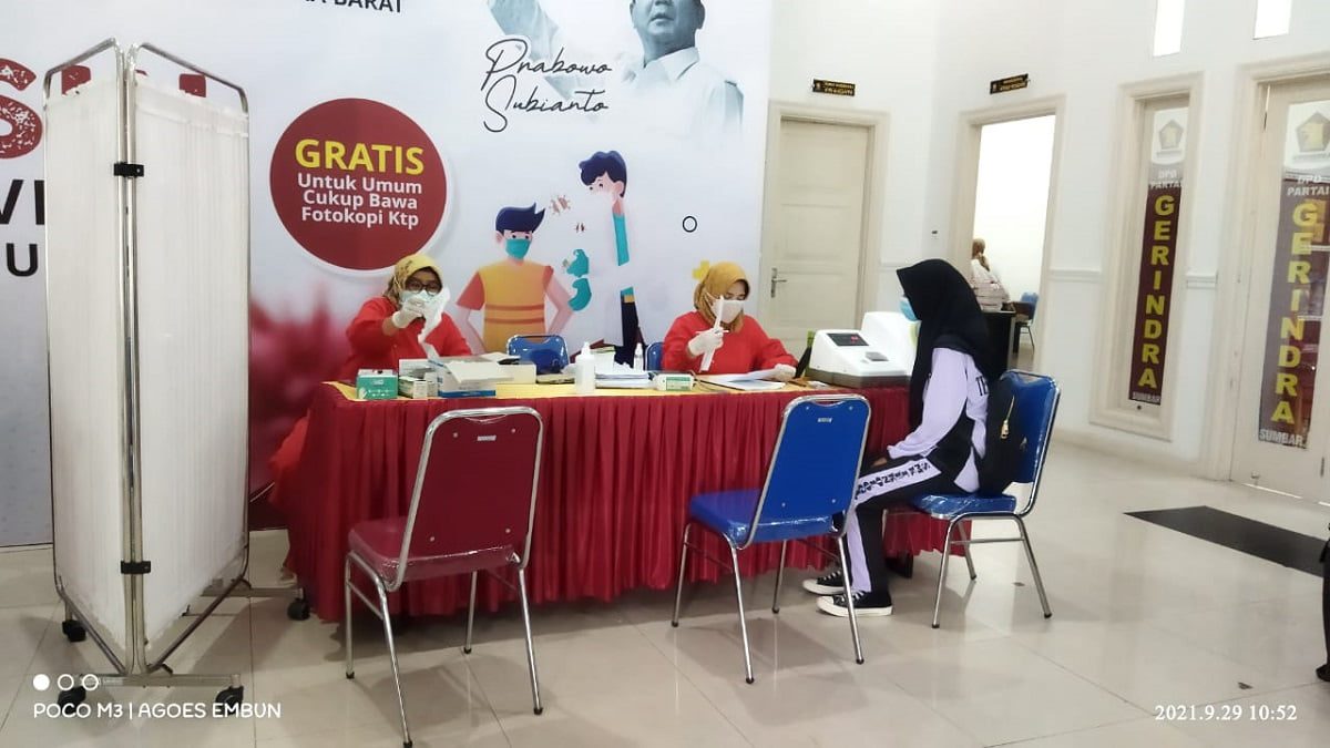 PADANG, RADARSUMBAR.COM – DPD Partai Gerakan Indonesia Raya (Gerindra) Sumbar kembali menggelar bakti sosial (baksos) vaksinasi Covid-19 gratis di Kantor DPD Gerindra Jalan Kapuas No.7, Kompleks GOR Agus Salim, Rimbo Kaluang, Kecamatan Padang Barat, Kota Padang. Vaksinasi ini digelar 29 September sampai 6 Oktober 2021 dan tidak dikenakan biaya.