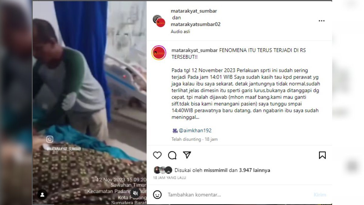 “Pada tgl 12 November 2023 Perlakuan sprti ini sudah sering terjadi Pada jam 14:01 WIB Saya sudah kasih tau kpd perawat yg jaga kalau ibu saya sekarat, detak jantungnya tidak normal,sudah terlihat jelas dimesin itu sperti garis lurus,bukanya ditanggapi dg cepat, tpi malah dijawab (mhon maaf bang,kami mau ganti siff,tdak bisa kami menangani pasien) saya tunggu smpai 14:40WIB perawatnya baru datang, dan ngabarin ibu saya sudah meninggal…,” begitu kutipan kalimat yang dinukil dari akun matarakyat_sumbar.