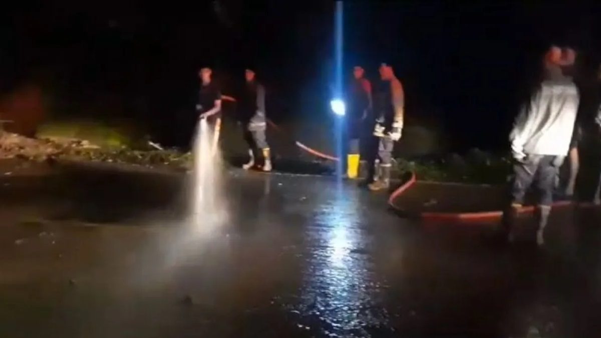 Petugas gabungan membersihkan material longsor yang menimbun dan memutus akses Jalan Nasional Sumbar-Riau, Rabu (15/11) malam. Pada Kamis (16/11) jalan sudah bisa kembali dilewati. (ANTARA/HO-BPBD 50 Kota)