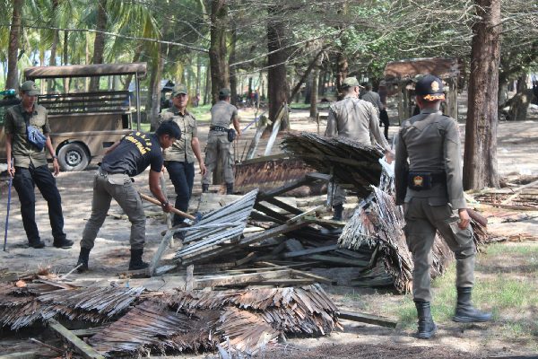 PADANG, RADARSUMBAR.COM – Sebanyak 40 pondok yang berada di bibir Pantai Pasir Jambak, Kelurahan Pasia Nan Tigo, Kecamatan Koto Tangah dibongkar petugas gabungan Satuan Polisi Pamong Praja (Satpol PP) Kota Padang, Sumatera Barat (Sumbar).