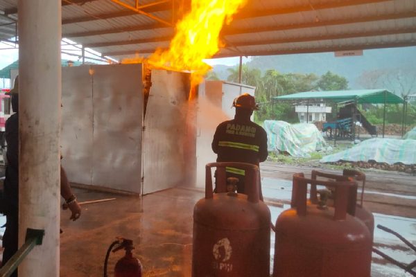 PADANG, RADARSUMBAR.COM – Percikan api membakar satu mesin briket atau oven pengering di PT Barokah Coco Indonesia.